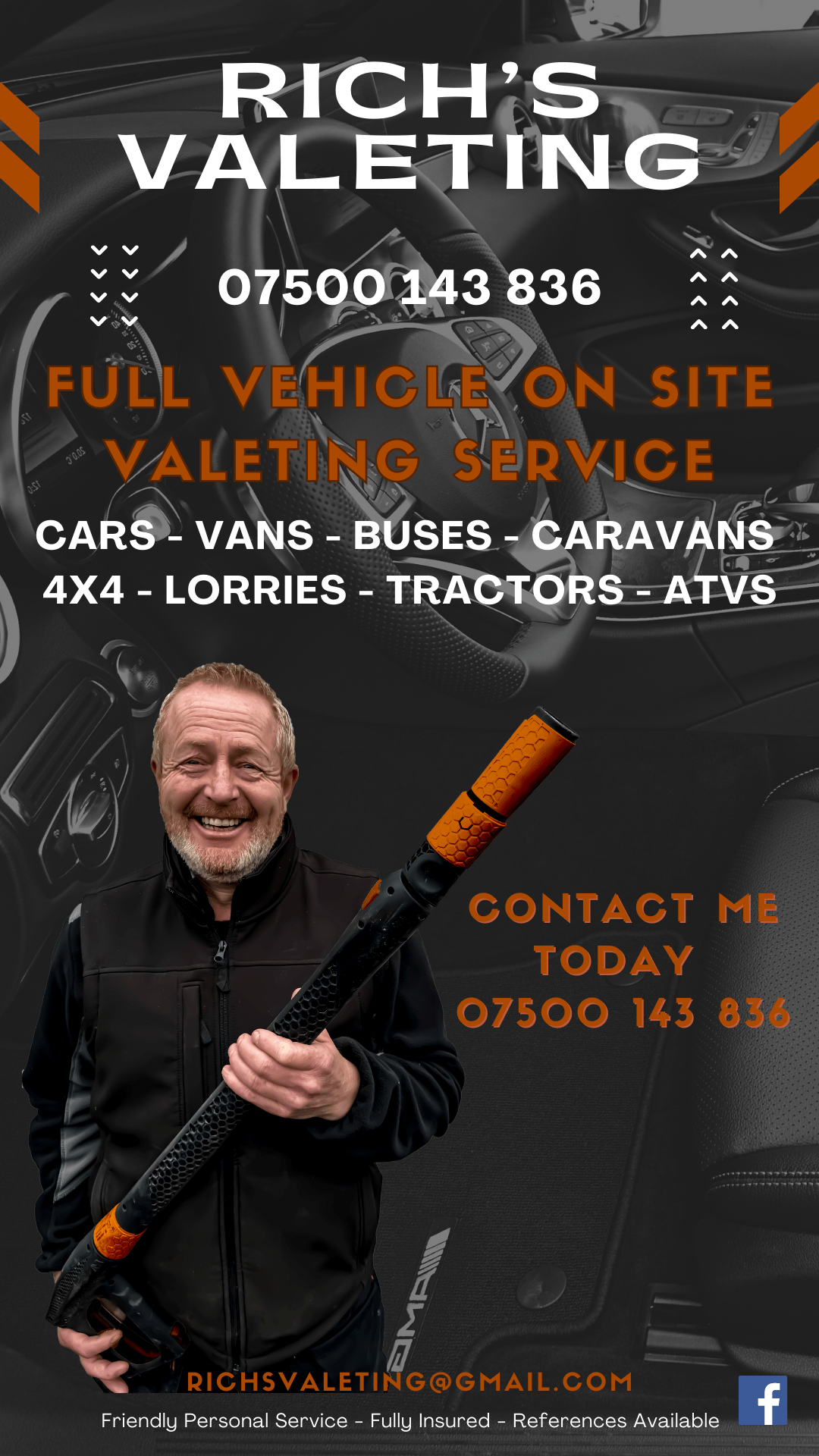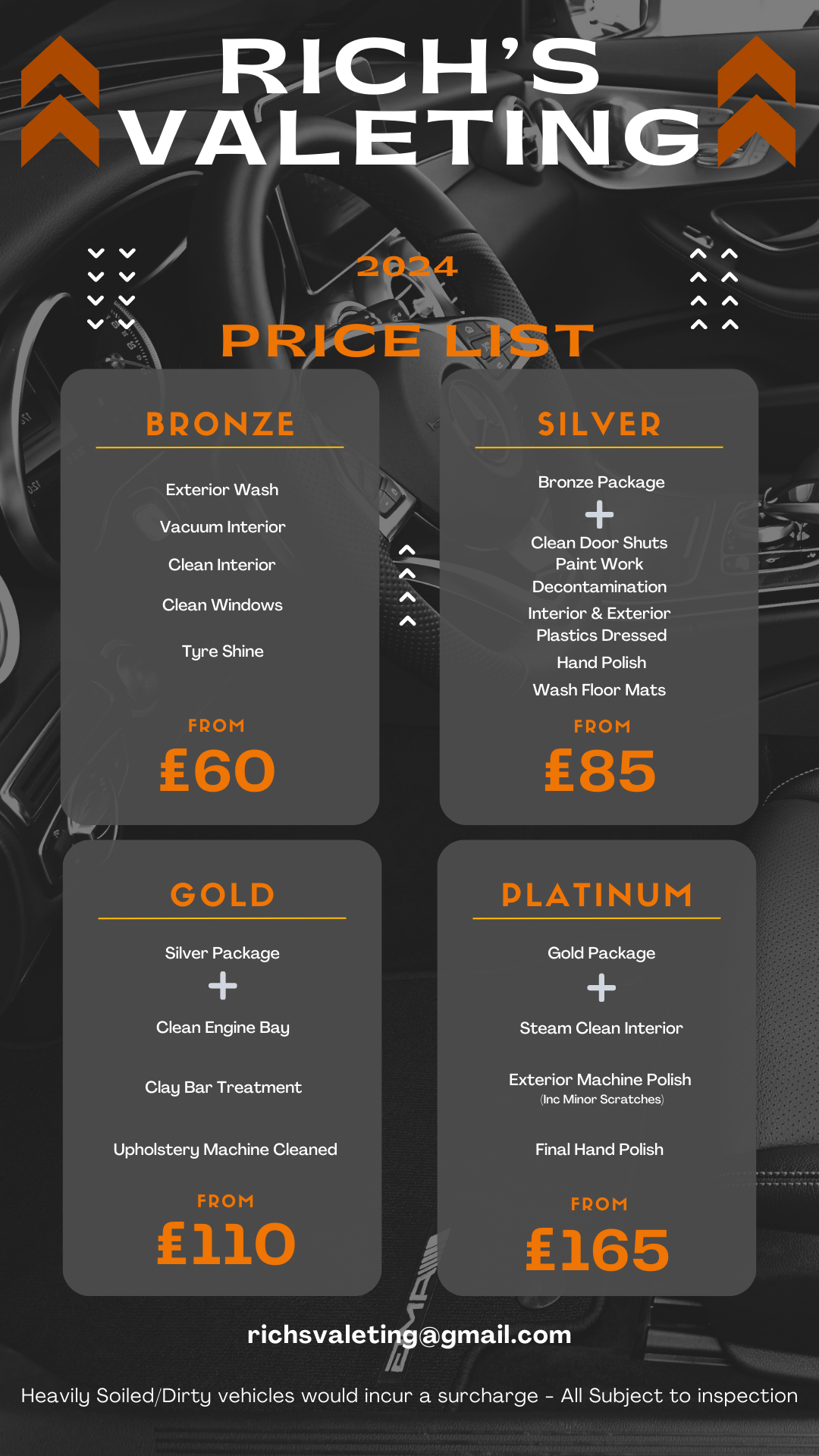 • Basic Cleaning • Full Valets • Upholstery Machine Cleaning • Exterior & Interior Cleans • Decontamination Treatments • Plastic Dressing • Engine Bay Cleaning • Tyre Treatments • Clay Bar Treatments • Steam Cleaning • Hand and Machine Polishing.